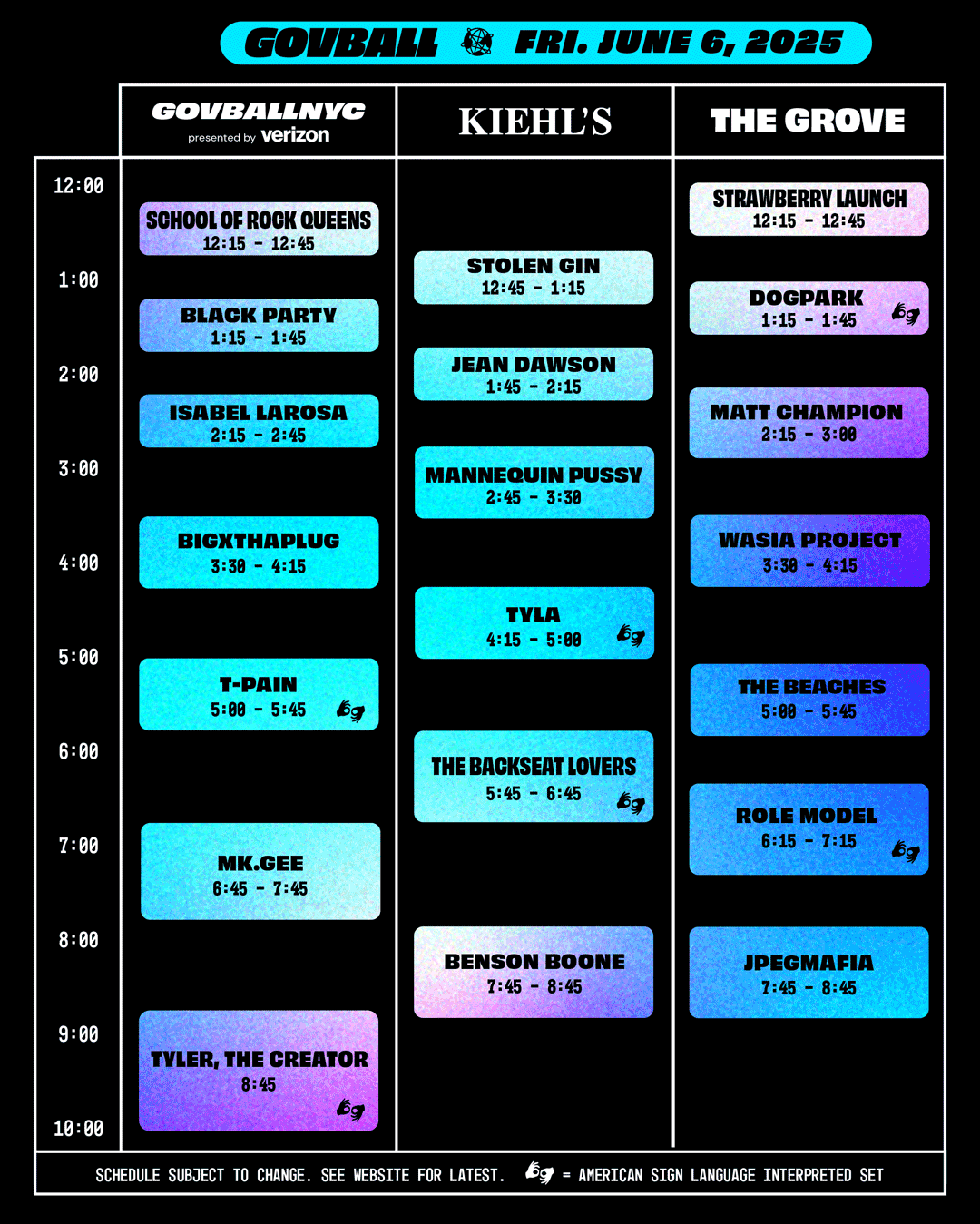 We ain’t got time for anything less than iconic – Tyler The Creator headlines on opening night, following evening performances by Benson Boone, JPEGMafia, MK Gee, Role Model, and the Backseat Lovers, with daytime performances by the Beaches, Isabelle Larosa, and more. To keep things local, School of Rock Queens opens up the festival, starting the festival on a bright, positive note that is sure to please fans of all genres.
