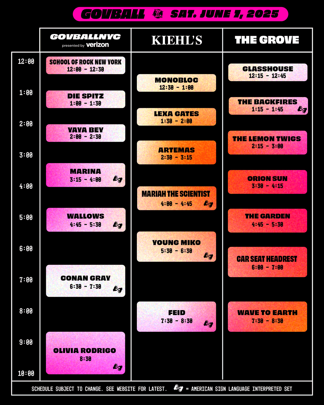 Another song, another club, another bar, another dance – On Saturday, pop sensations take over the mainstage, with Marina, Wallows, Conan Grey, and more performing ahead of headliner Olivia Rodrigo. Keeping with the theme of paying homage to the city that never sleeps, School of Rock New York kicks off the mainstage at noon. Saturday is typically THE day for any festival, and with a lineup like this one, Gov Ball doesn’t disappoint.
